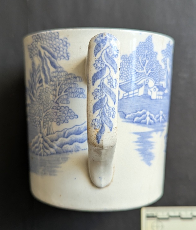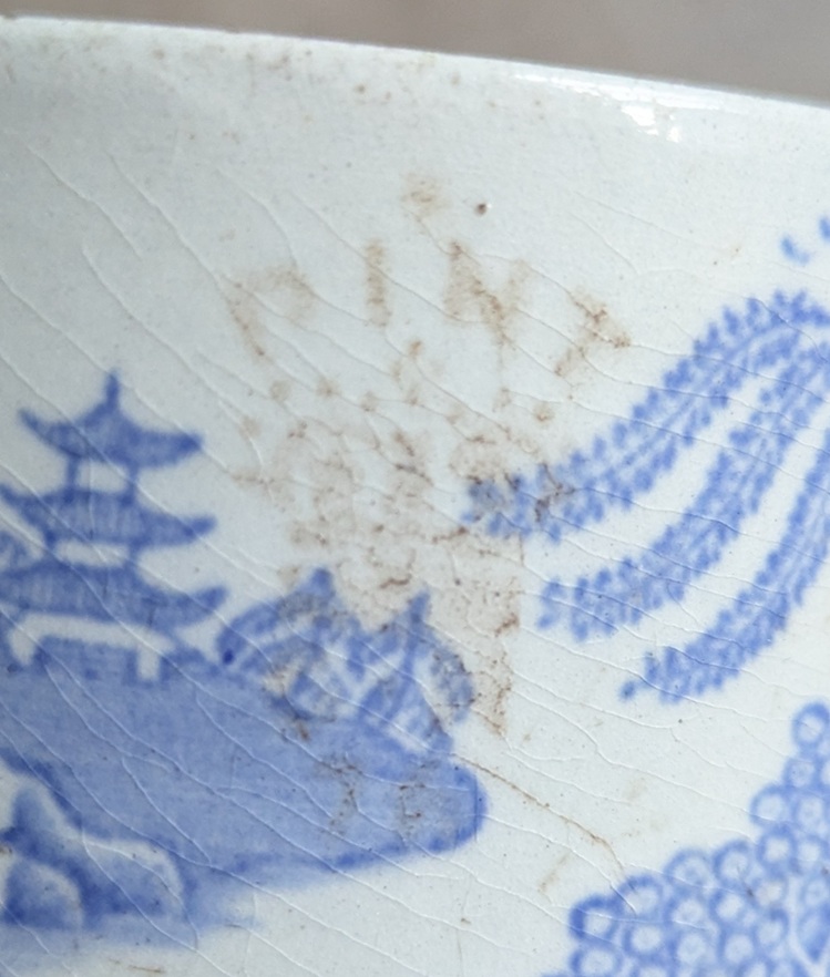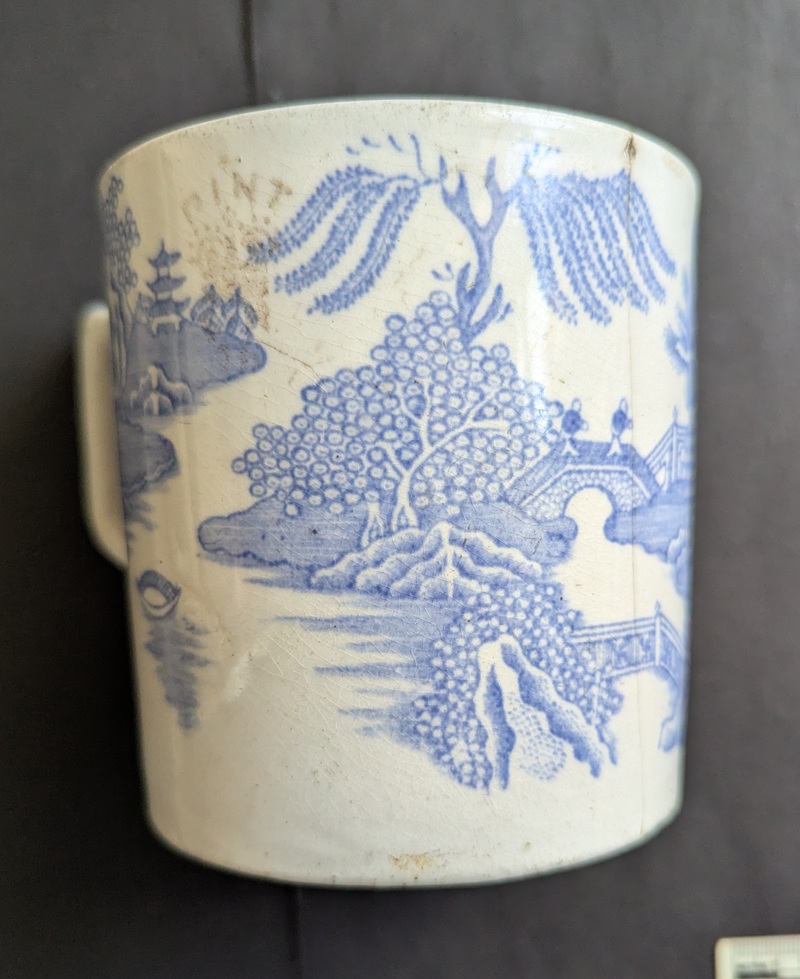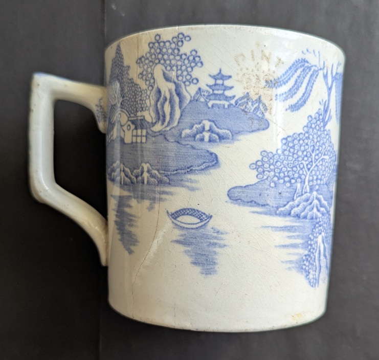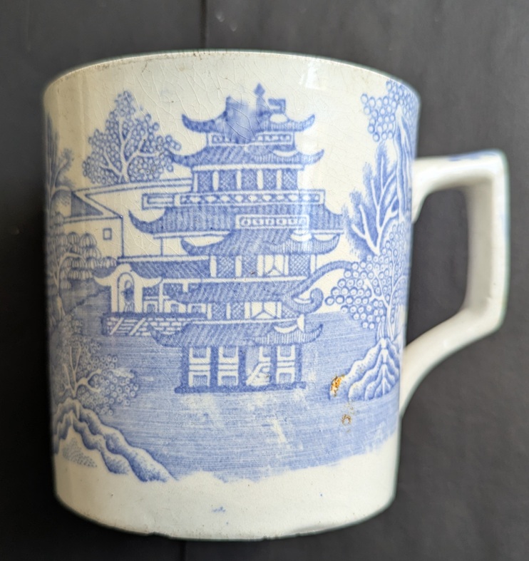 So then, it’s a mug. Blue and White transfer printed, and not particularly high quality. Victorian, I guessed. Biggish, but not huge, and not very refined in shape or small in size – 9cm in diameter – so didn’t immediately strike me as a tea cup… just a mug. Here it is: