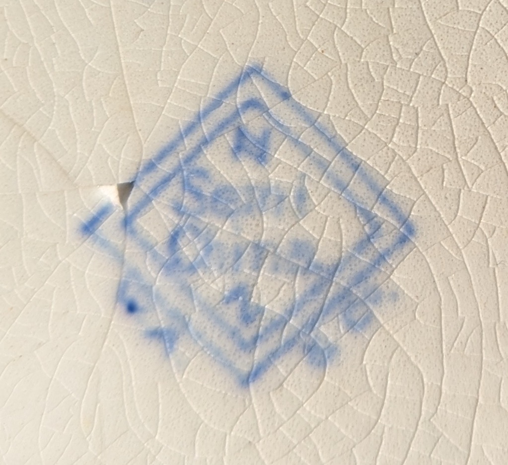 With the eye of faith, squinting, and on my third glass of stuff that cheers… it reads “Semi China”, and says “W A and Co” around the bottom of the lozenge. Presumably the other letters refer to the shape, and decoration type, etc. Anyway, it was a lead, and something to chew on.