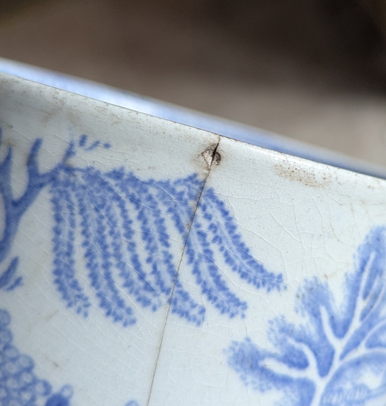 The actual standard of the transfer is poor too – I’m by no means an expert in this stuff, but it’s not a top notch engraving. It’s also not a standard willow pattern – it is ‘Chinese’ inspired, but not the tale of the two lovers changed into birds, etc. Instead, it is a pile of pagodas, Asiatic trees… and weird fish people, walking on their tails, and attempting to do the conga over a bridge. Which is… different.