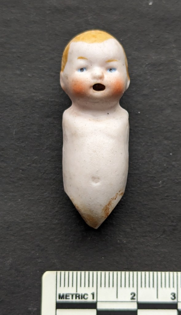 I’m not fond of dolls, they honestly give me the creeps. But I think it is quite common for humans to be unnerved by things that look quite like us, but which aren’t us; the ‘Uncanny Valley‘ is the term for such feelings. It’s not an outright phobia, more a dislike or a sense of unease. Although I have to say, I do like the expression it has – a sort of open-mouthed surprised look… not unlike my own expression when I unwrapped this wonderful, if creepy, item. So then, here we have an remarkably complete Victorian bisque – or unglazed porcelain – doll. It’s tiny, and only the body remains – the arms and legs would have been a material, or perhaps porcelain with a single rivet joining them so that they were movable. The whole would have been clothed, or wrapped in a blanket, but this has long since rotted. The incredible detail in the colouring of the eyes, hair, and face would indicate that it was a relatively expensive one, and it would have looked something like this when ‘alive’.