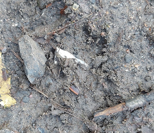 Also in the photograph, the tip of a slate pencil. I often find these, and the other day was idly wondering why it is that I only ever find the tips, never the stems. Then I realised – it’s a single stick of slate – if it gets broken, the end can be sharpened, and voila… a new pencil.