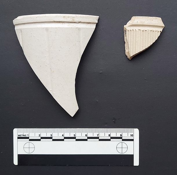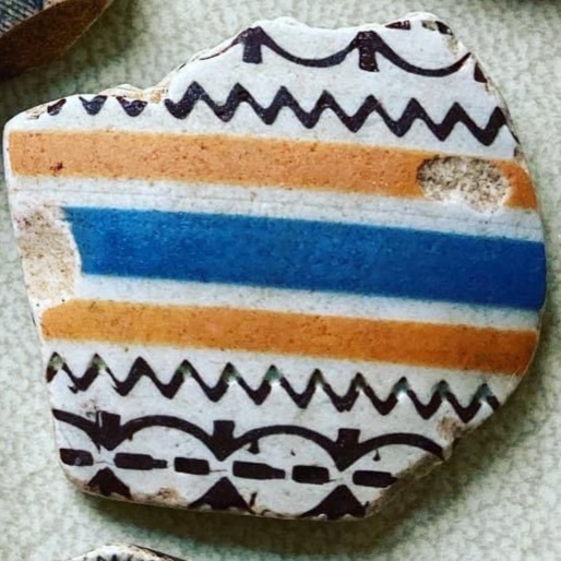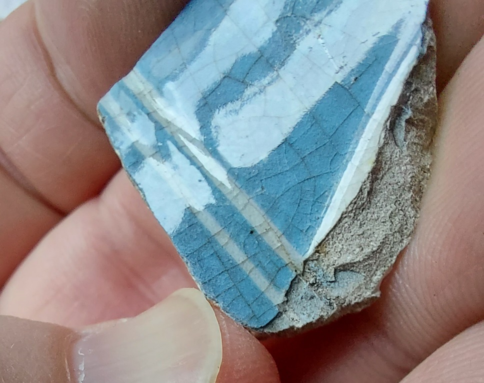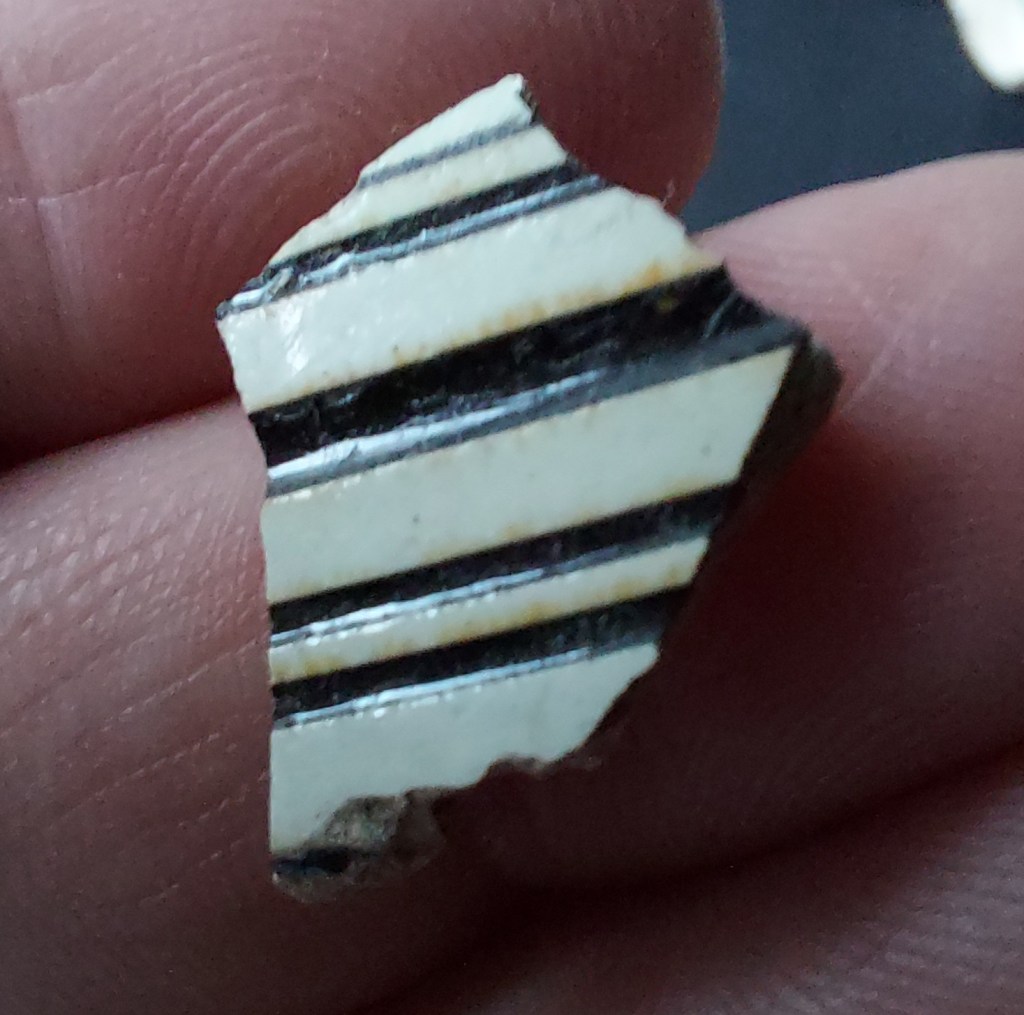 Next row, a sherd of marmalade/preserve jar (here, for more information), and then two thoroughly uninspiring sherds of white glazed pottery. Then, this beauty!
