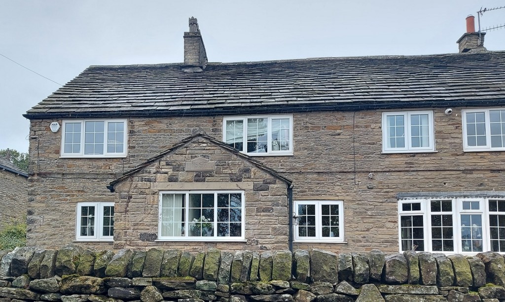 Whitfield Barn is on Cross Cliffe, the old trackway. As the name suggests it is a converted barn with probable farm house attached (another example of a ‘laithhouse’, that is a building made up of a house, barn, and byre/shippon in one). The stone is modern, and whilst the building is old (1750 – 1800, say), it doesn’t look like one built in the mid 17th century. Now, I’m not suggesting anything is incorrect, and it is likely that the building has a core that is of that date, and that the owners simply had a stone carved to reflect that. Indeed, if you look closely, you can see a number of different building phases. In particular just below the roof, where the upper floor has been raised, you can see the original roof line marked out in a line of stone.